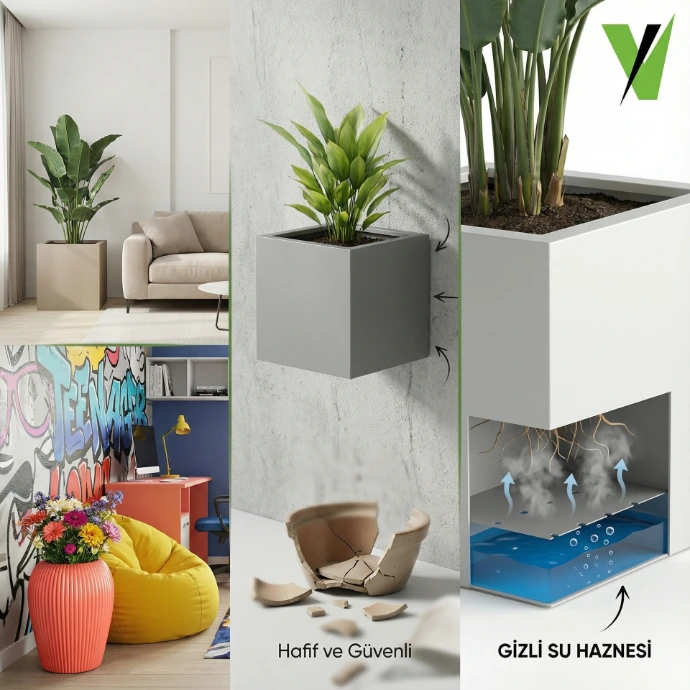 - **Güvenlik:** Hafif yapısı sayesinde devrilme esnasında seramik veya beton saksılar gibi büyük bir tehlike yaratmaz.
