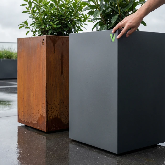 Paslanmaz çelik veya Corten metal saksılar gibi, fiber/polyester saksılar da yağmur ve suya karşı üstün dayanıklılık gösterir. İçinde rutubet barındırmaz, saksıda herhangi bir bozulma, şişme veya renk değişimi yaşanmaz. Bu sayede saksınız uzun yıllar boyunca ilk günkü estetiğini korur, içinde yetişen bitki de sağlıklı ve uzun ömürlü bir gelişim sağlar.